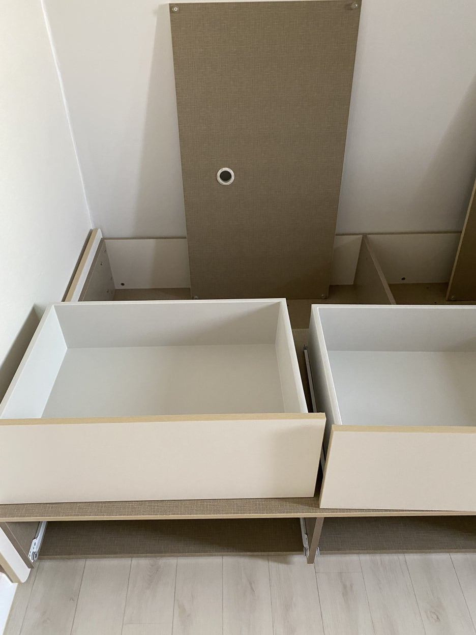 한샘 아임빅 수납침대는 아래 사진과 같이 레일이 달린 서랍장이 3개가 달려 있어서, 아이 옷을 집어 넣기가 정말 좋다.