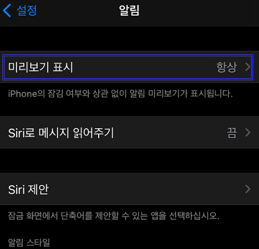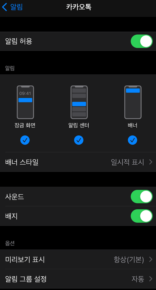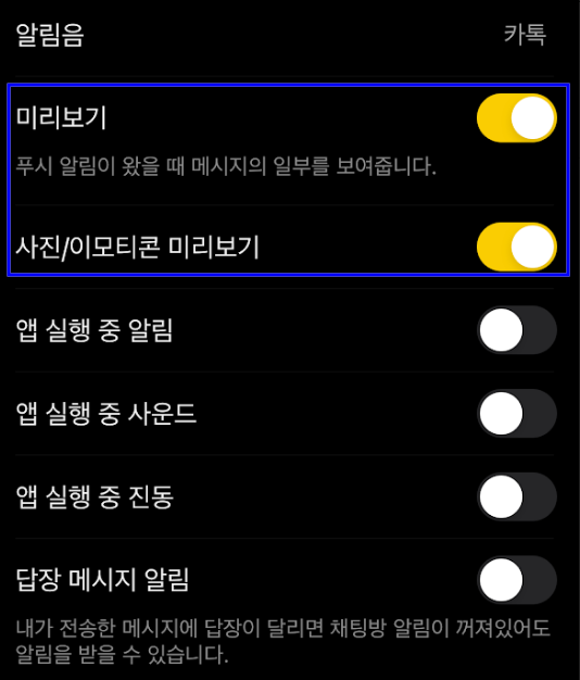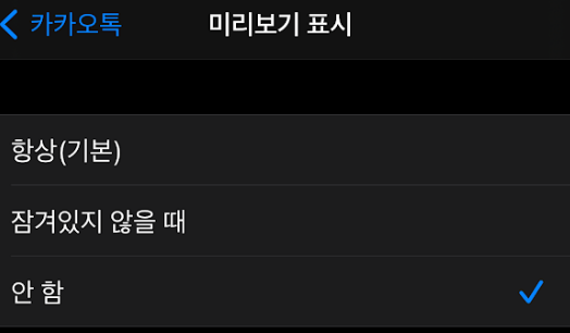 이 설정은 내가 별 생각없이 사용했던 설정으로 아이폰 설정은 동일하고 카카오톡 미리보기 설정만 아래와 같이 바꿔주면 된다.