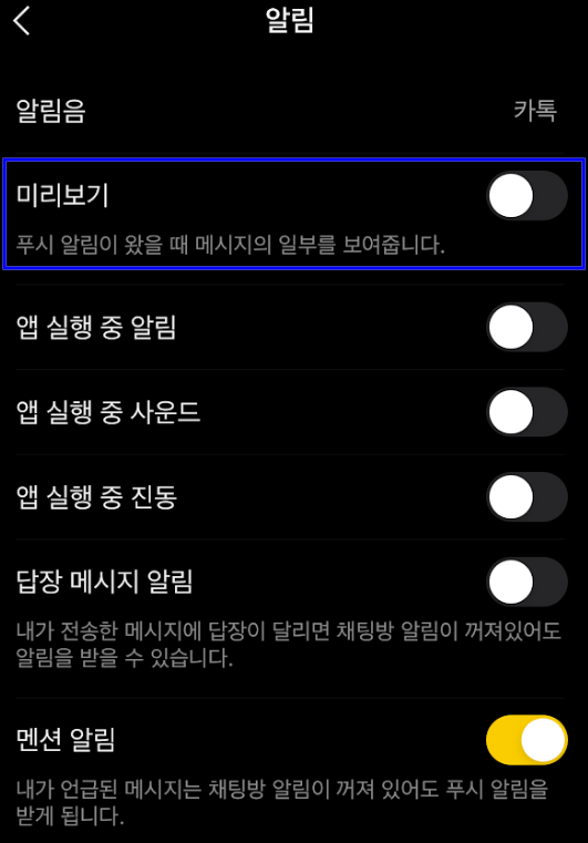 여기까지 설정한 후에, 카카오톡 앱-설정-알림에 들어가 아래와 같이 미리보기를 꺼준다.
