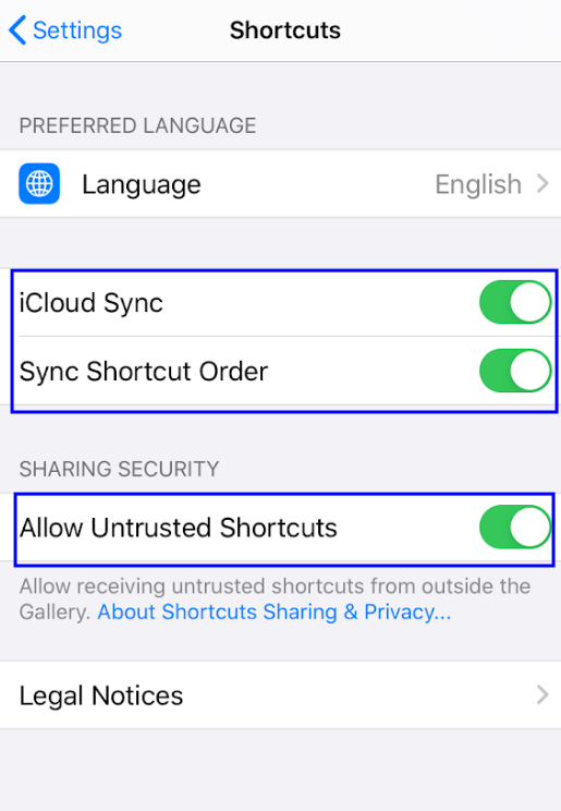 그러면 설정에 단축어라는 항목이 추가가 되는데, 단축어에 들어가서 표시된 항목을 모두 활성화 시켜준다.
