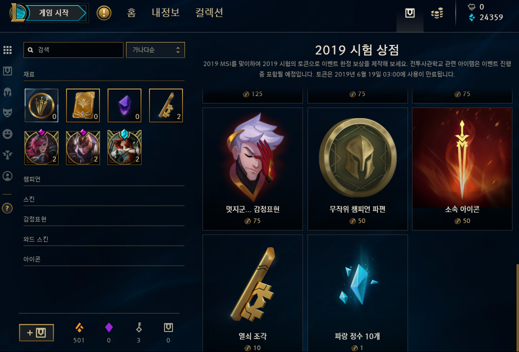 지난번 글에서도 말씀드렸는데요. 롤에서는 종종 이벤트를 합니다. 제가 그때마다 어설픈 아이템으로 바꾸지 말고 차라리 열쇠를 바꾸라고 말씀드렸는데요. 이번 MSI 이벤트도 마찬가지입니다. 별거 없더라고요. 제 기준으로 별거는 스킨을 주는 상자나 보석입니다. 이번 시험의 토큰 같은 경우, 얻기가 매우 수월합니다. 이벤트 1개 달성시, 보통 토큰을 15개씩 주니, 이벤트 2개 완수하면, 열쇠 조각 3개=온전한 열쇠 1개를 얻을 수 있습니다. 총토큰을 몇 개나 줄지는 모르겠으나, 열쇠로 바꾸는 것을 추천합니다.