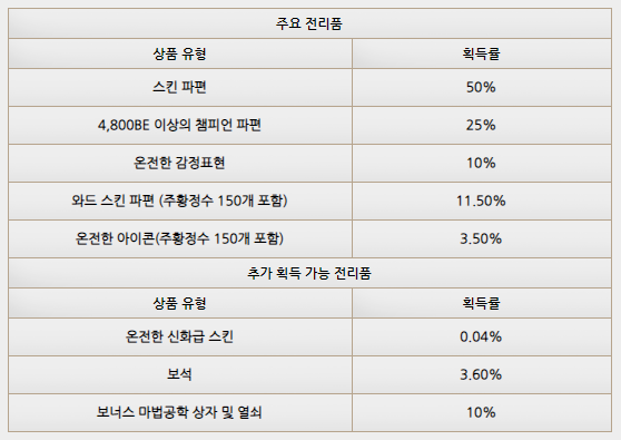 | 마법공학 상자 상품 획득 확률, 명품상자 상품 획득 확률, 수수께끼 상품상품 획득 확률, 월챔이라구의 상품 획득 확률 (0) | 2024.09.07 |