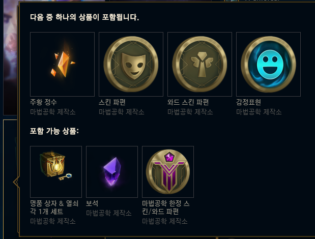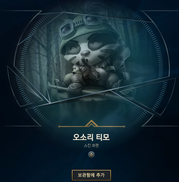 오소리 티모 스킨 파편을 받았다...요즘 라이엇 안되겠네...3개 모아서 그냥 갈아버려야 겠다. 보석에서 나왔으니, 재조합시에 뭔가 좋은거 주지 않을까 살짝 기대해보며...