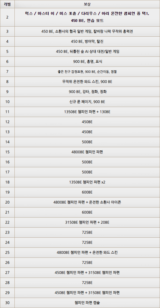 30레벨 부터는 챔피언 파편을 획득할 수 있는 캡슐이 주어지는데, 하나의 캡슐을 열어서 여러개의 챔피언 파편을 얻을 수도 있다. 그 중에서 보석을 주는 레벨은 다음과 같다. (감정표현 따위는 일단 제외하고)