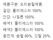 제품의 소재는 다음과 같다. 내일 아침에 영하 10도 아래로 떨어지던데, 얼마나 추위를 막아줄지 기대가 된다.