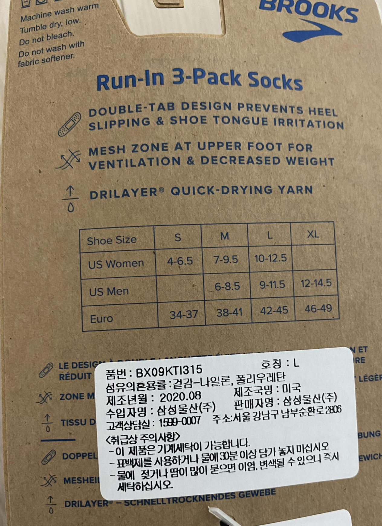 브룩스 운동화의 내피 재질과 정말 찰떡인게, 브룩스 운동화 자체의 착용감도 정말 좋은데, 브룩스 양말과 같이 신으면 그 느낌이 배가 된다. 러닝용으로 한번쯤 신어보길 추천한다.
