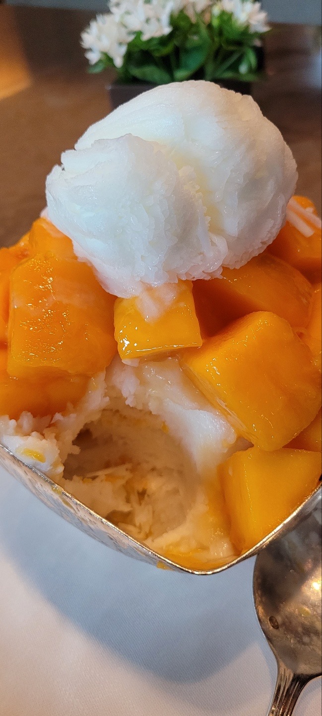망고 셔벗은 롯데호텔 망고 빙수보다 조금더 달았는데, 마치 콩포트를 얼린것 같았고, 우유 얼음이 베이스고 그 밑과 사이사이에 망고 셔벗과 망고 퓨레가 들어 있다. 아래는 처음 세팅됐을 당시의 사진이다.