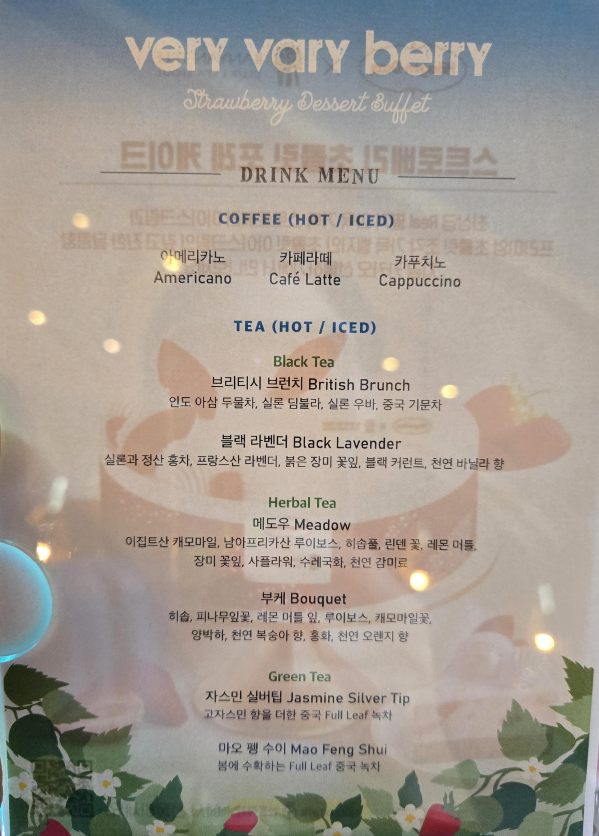 기본으로 나오는 코스는 웰컴드링크로 딸기모히또(논알콜), 그외 하겐다즈 모나카, 커피(1회리필가능) 또는 티(리필시 따뜻한 물로 대체)가 제공되었다.