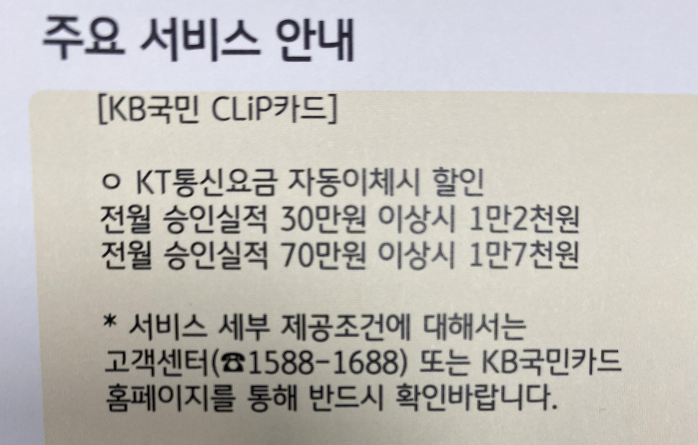 신용카드를 활용한 가장 첫번째 절약은 바로, 실적과 연계한 통신요금 할인을 받는 것이다. 인터넷 재약정을 진행하면서, 인터넷 요금 할인을 받고자 여러 신용카드를 알아본 결과, 실적 인정 범위가 넓고, 실적 요구 금액도 30만원으로 저렴한 KB국민 clip카드를 발급 받았다.
