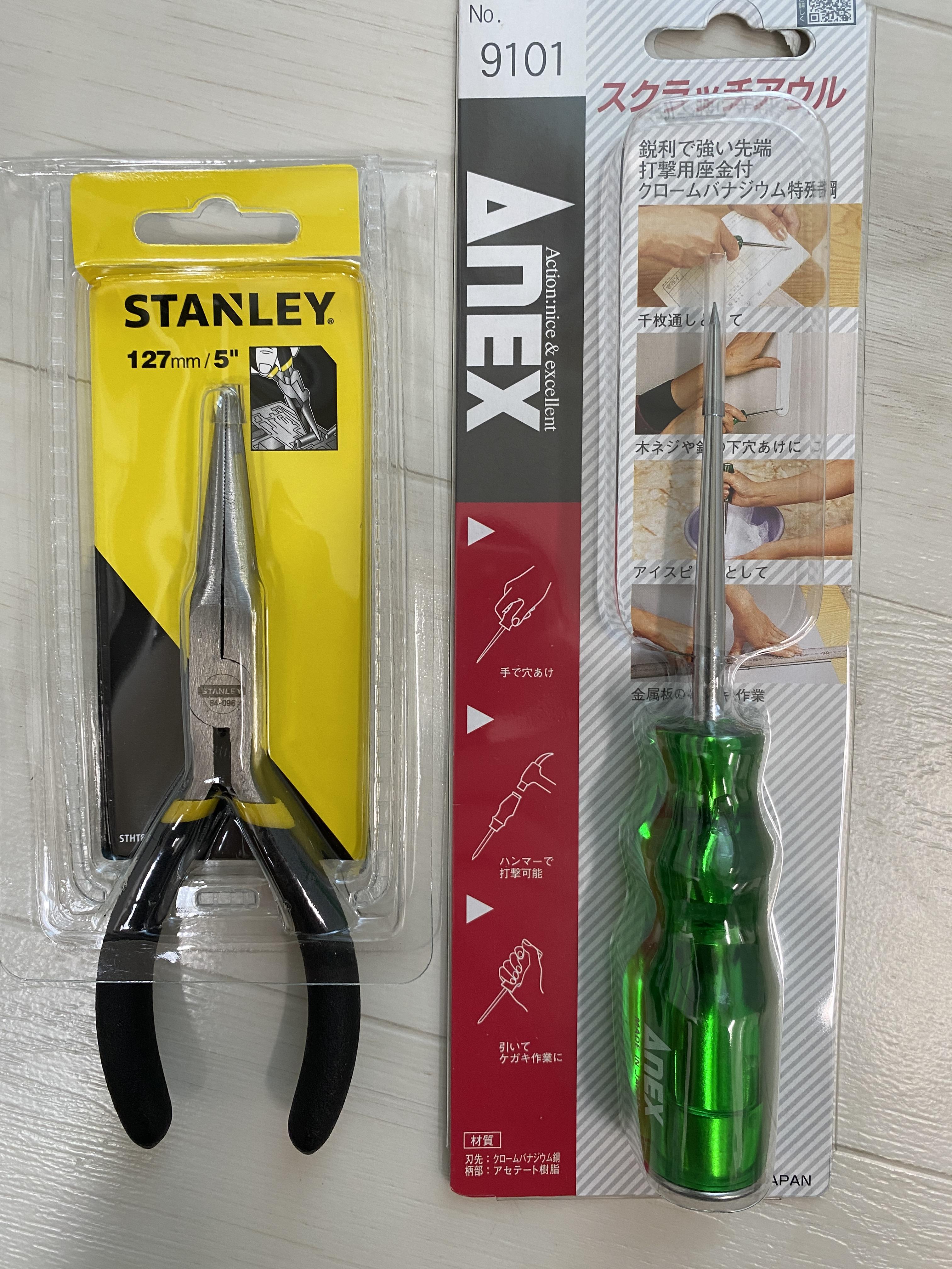 그리고 송곳은 모헤어를 끼우고 뺄때 모두 필요하다. 나는 지나치게 좋은걸로 샀는데, 아넥스 송곳 다가네 드라이버 9101로 금속판에 금을 긋거나 철판이나 캔 타공을 할 수 있을 정도의 강도를 가지고 있다.