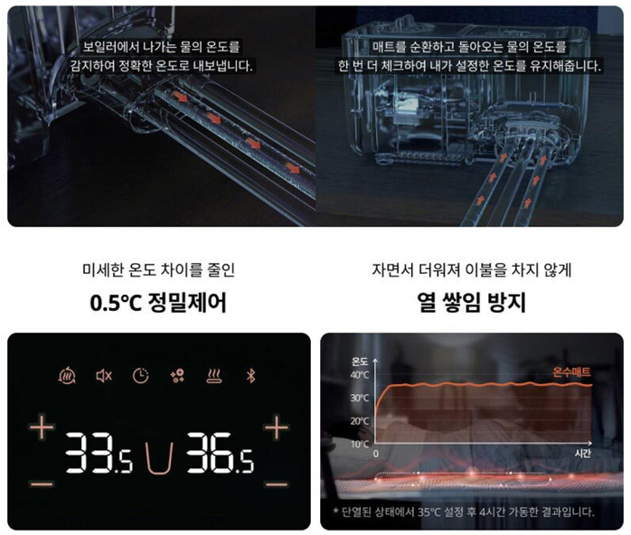 온수매트로서 필요한 기능은 왠만한건 다 있다고 보면 되는데, 사용되는 물에 대한 이온케어, 겨울지나고 보관시에 필요한 물빼기 기능도 있고, 온수매트에 대한 커버도 제공되고, 자동전원차단 기능까지 필수적이라고 생각되는 기능은 다 들어있다. 온도는 1도씩 조정된다.