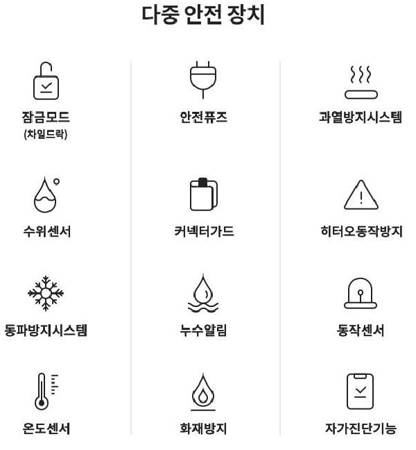 아래와 같이 다중 안전 장치 설정이 되어 있다고 한다. 물 집어 넣을때 수위센서 확인하는거 정도 빼고는 딱히 만질일이 없긴하다. 참고로 그냥 수돗물 넣으면 된다.