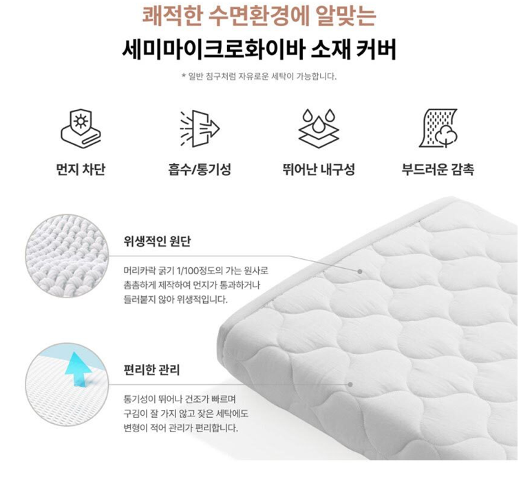 아..같이 제공해주는 커버에 대한 광고 내용이 늘었다. 아래와 같이 좋은 커버라고 한다. 물론 우리집은 그 위에 기존에 사용하던 패드를 동일하게 사용중이라, 커버 위에 직접 누울일은 없으니 큰 차이는 모르겠다. 하지만 좋다고 하니, 별도의 패드 사용 없이 바로 사용하고, 설정 온도를 좀 낮춰서 사용하는 것도 고려해볼수 있을 것이다.