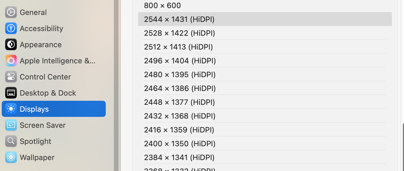 이 중에 마음에 드는걸 고르면 되는데, HiDPI가 적용되지 않은 기존 외장모니터의 최고 해상도는 선택할 수가 없고, 그 보다 바로 아랫단계 수준부터 나오게 될 것이다. 2560 x 1440과 비교해서 99% 수준이다.