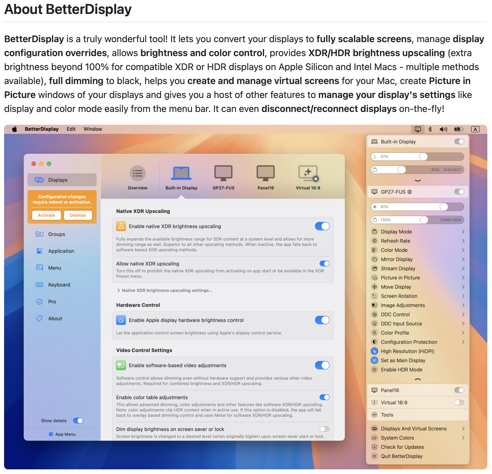 Unlock your displays on your Mac! Flexible HiDPI scaling, XDR/HDR extra brightness, virtual screens, DDC control, extra dimming, PIP/streaming, EDID override and lots more! - waydabber/BetterDisplay