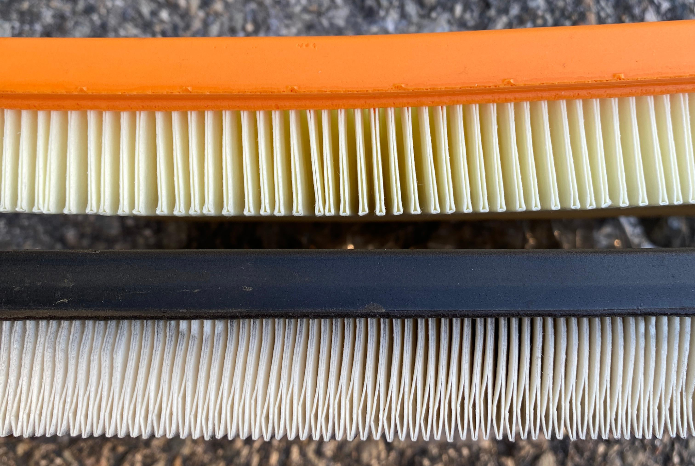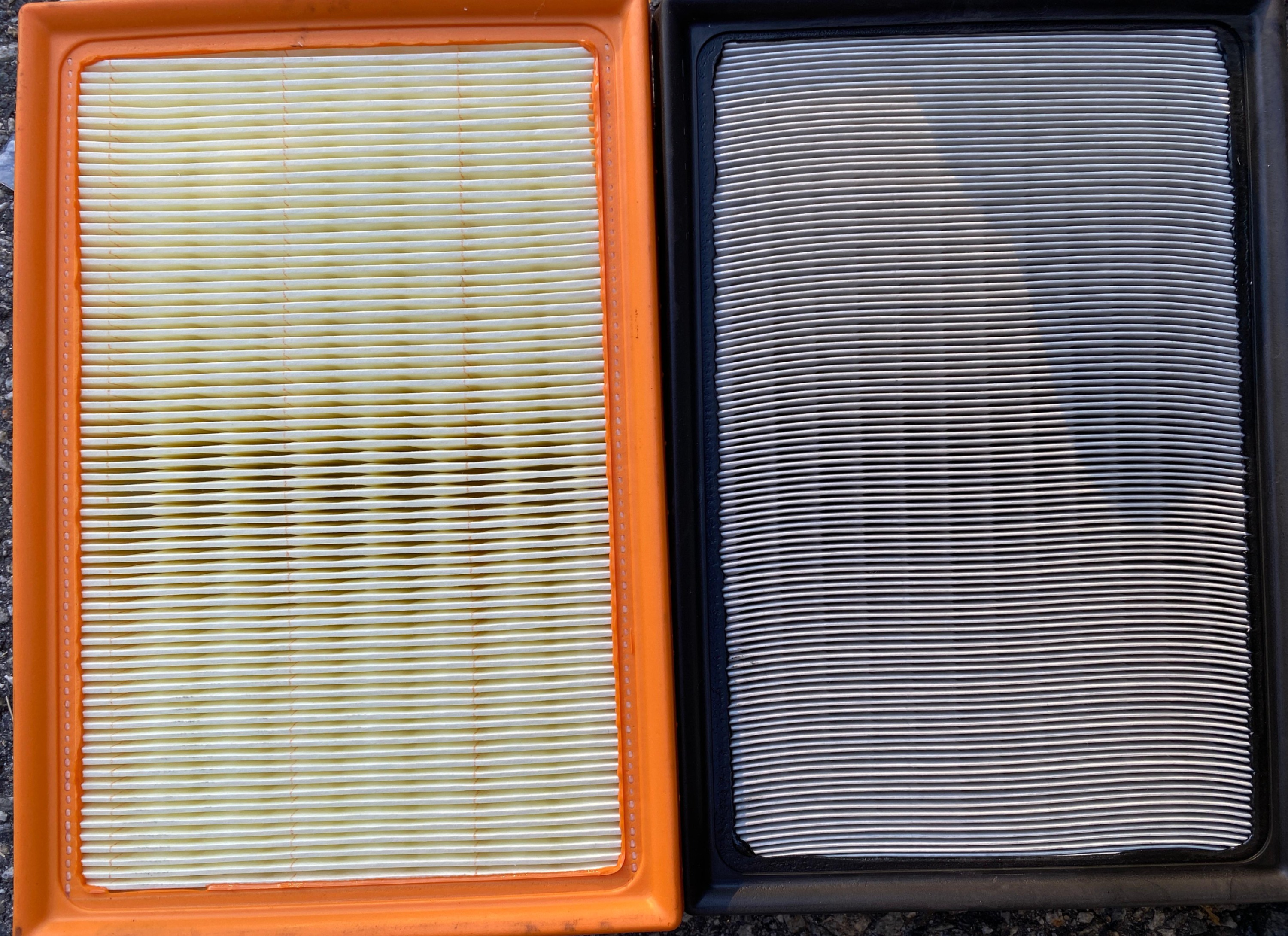왼쪽이 새로 구입한 에어클리너고, 오른쪽이 기존에 있던 자동차 회사 정품이다. 기존 정품이 좀 더 촘촘하게 보이긴한다.