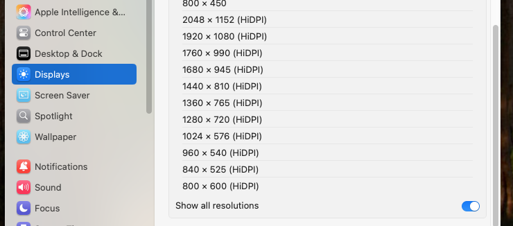 내가 입력한 모든 해상도가 나오진 않았지만, 그래도 hidpi가 적용된 거의 QHD에 가까운 해상도를 선택할 수 있었고, 이렇게 적용해서 잘 사용하고 있다.