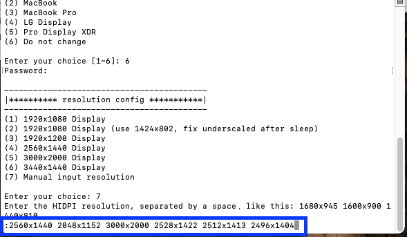 그러면 HIDPI라는 글자가 써지고, 기본 맥북의 모니터와 확장 모니터명이 숫자로 나오며, 나는 확장 모니터니까 그 숫자를 누르고 엔터를 눌러주면 된다. 왠지 이렇게 숫자만 가지고 엔터치고 진행되는 화면을 보니, 윈도우 컴퓨터 바이오스 설정할때가 떠오른다.
