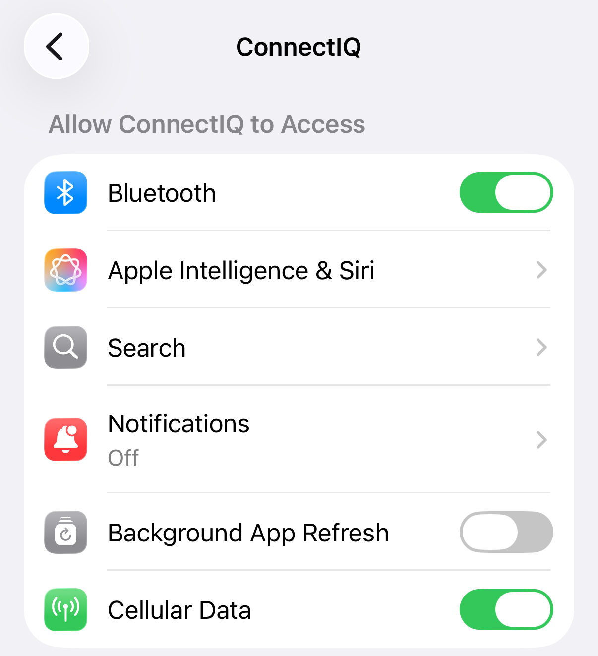 그래서 아이폰 설정 - 앱 - connect IQ를 들어가보니, 블루투스가 꺼져있는게 아닌가?? ㄷㄷㄷ