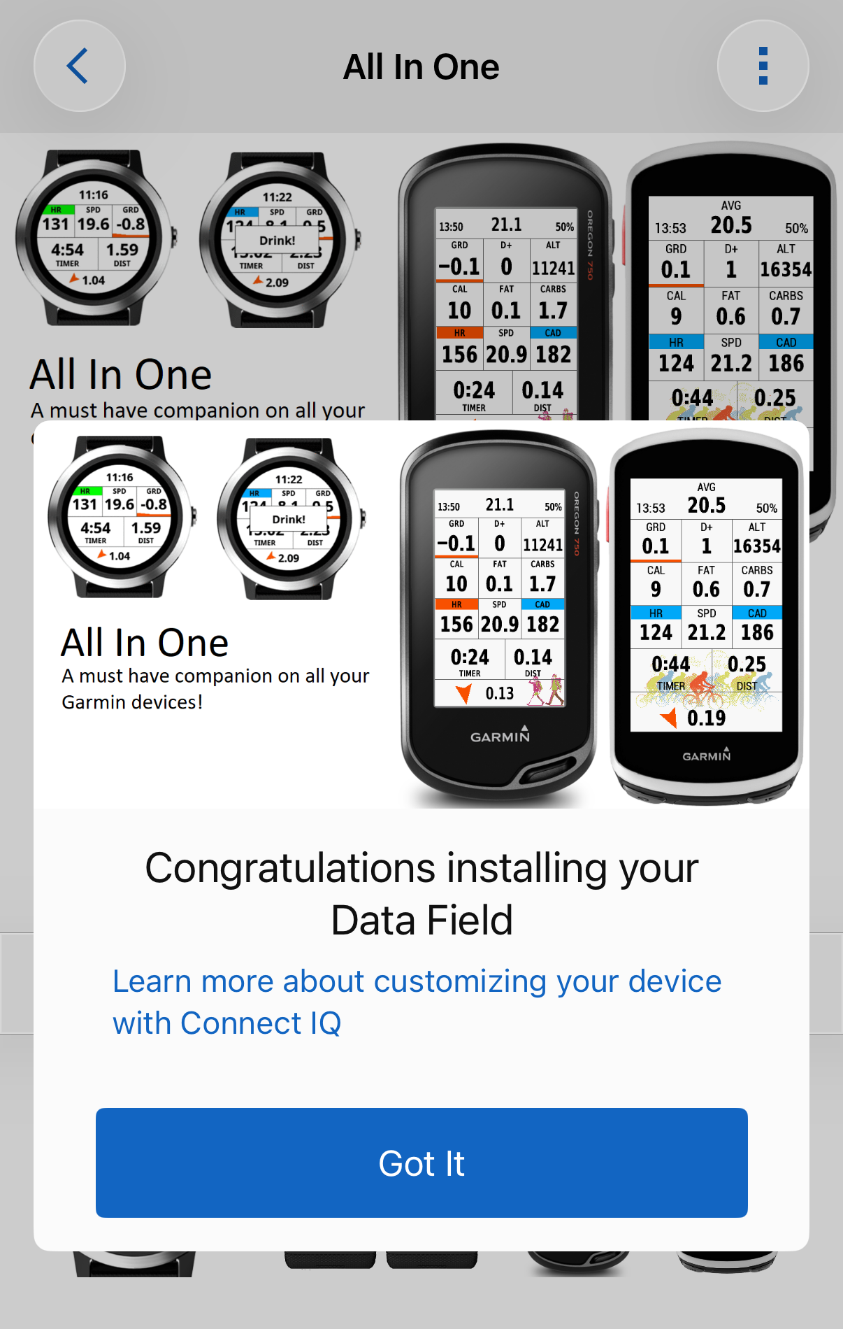 하지만 우리에게는 connect IQ라는 어플이 존재한다. connect 어플이 데이터를 보기 위한 것이라면, connect IQ는 가민에서 보여지는 화면들을 커스텀 할 수 있게 도와준다.