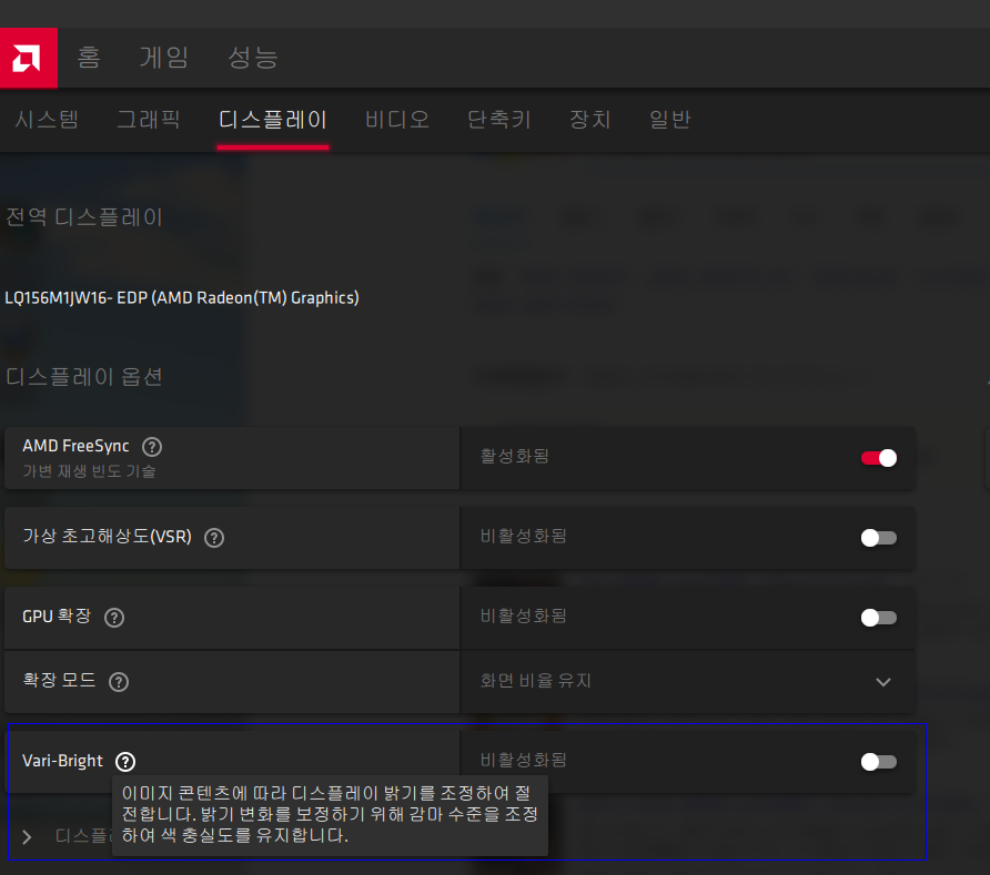 노트북 구입시 노트북 자체의 성능, 그러니까 얼마나 원활하게 내가 원하는 프로그램을 돌릴 수 있는가에 대한 기준으로 따져본다면 100만원 이하에서 생각보다 좋은 성능의 노트북을 구할 수 있다. 여기서 가격을 더 쓴다면, 무게와 디스플레이 패널의 밝기와 색영역일 것이다. GA502IV는 르누아르 CPU가 탑재되어 있는 AMD제품으로 라데온 소프트웨어를 기본으로 사용한다. FHD이긴하지만 240Hz에 sRGB 100%, 그리고 300니트의 밝기를 가지고 있어 노트북 패널치고는 상당히 괜찮은 제품인데, 최대 밝기를 했음에도 불구하고 생각보다 화면이 어두웠고, 어떤 화면이냐에 따라 조금씩 색감이 바뀌는 것을 확인할 수 있었다. 이건 라데온 소프트웨어에서 제공하는 자동밝기 기능이 켜져 있기 때문인데, 이걸 꺼주면..