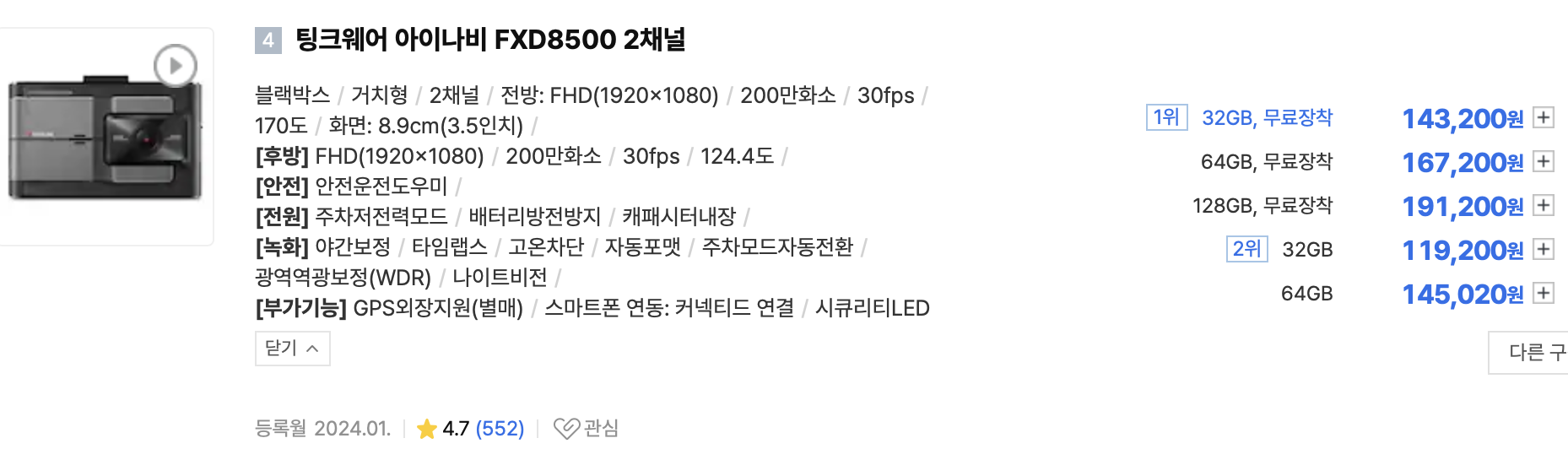 거의 10년동안 사용했던 블랙박스가 고장이 났다. micro SD카드 인식이 안되는 문제였는데, 며칠 해결책을 찾아봤는데 여전히 녹화가 되지 않았다. 일주일 정도 그냥 블랙박스 없이 지내봤는데, 이게 운전을 혼자하는 것도 아니고, 10년 전 제품이라, 고쳐봤자 너무나 조악한 화질로 인해 이제는 문제가 될수도 있을 것 같아서 과감히 교체를 결정했다. 애초에 처음 블랙박스가 설치된 이유도, 차 구입했을 때 영맨이 서비스로 달아준 거라서, 어디서부터 시작해야할 지 막막했다.딱히 고민을 해본적이 없어서 사실상 처음 고른 블랙박스라고 해야할까?? 일단 에누리와 다나와에서 순위를 검색해봤다.굉장히 많은 브랜드가 있었지만, 대충 10위권 안에 파인뷰와 아이나비가 있었다. 그래..많이 팔리는 건 이유가 있겠지.그리고 ..